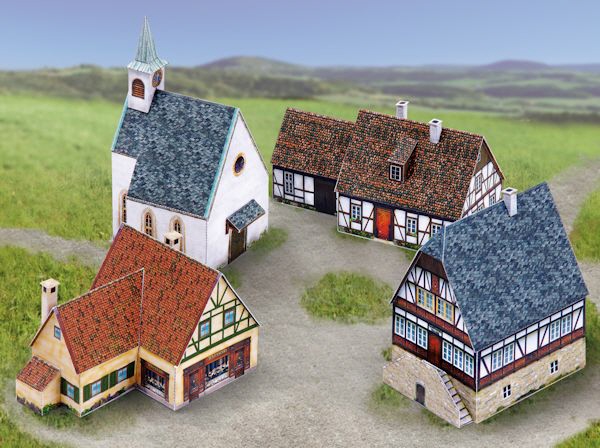 Dieses Set ist eine schöne Ergänzung für Modellbahnanlagen in Spur N. Es besteht aus vier Gebäuden, die im Dorfleben eine wichtige Rolle spielen: eine Kirche, eine Bäckerei, ein Gasthaus und ein Bauernhaus.