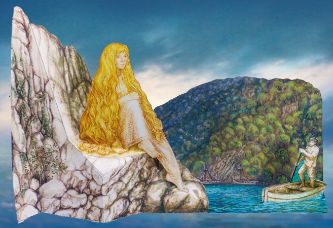 Im Stil der bestehenden Reihe von Märchenbogen ist der Bogen von der Loreley entstanden. Sie sitzt auf ihrem Felsen mit dem langen goldenen Haar. Unter ihr der Fluss mit den Schiffern.
