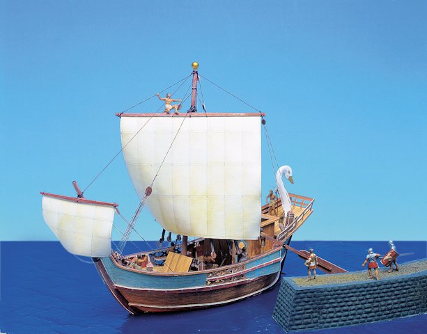 Dieses Modell eines römischen Frachtschiffs besticht durch die außergewöhnlich schöne Gestaltung. Bei der Konstruktion wurde auch bei den Innenbauteilen auf größtmögliche Originaltreue geachtet: die Spanten haben Holzmaserung, der Mast läuft durch das Deck bis zu seiner Aufnahme am Kiel. Ein attraktives Modell für anspruchsvolle Modellbauer.